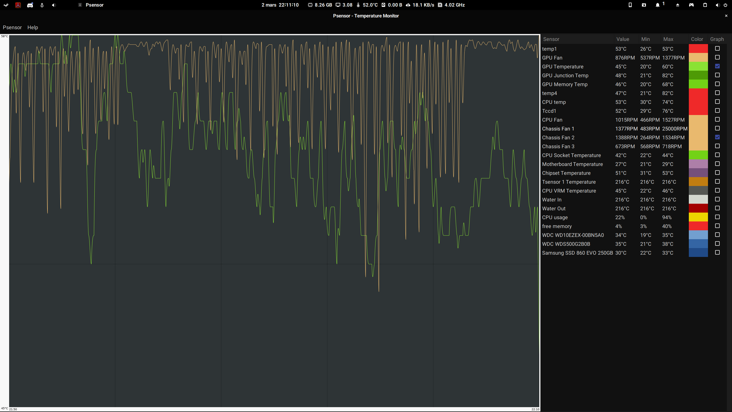 intervalis in seconds.One weird thing: I see fans do a lot of ups and downs (going from 1500 RPM to 1200 RPM to 1500 RPM in 2 seconds) when the temp is at 57 and the target is 50: